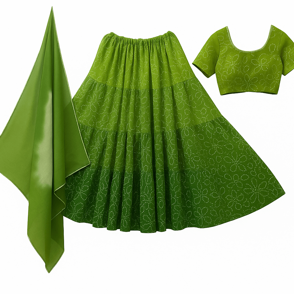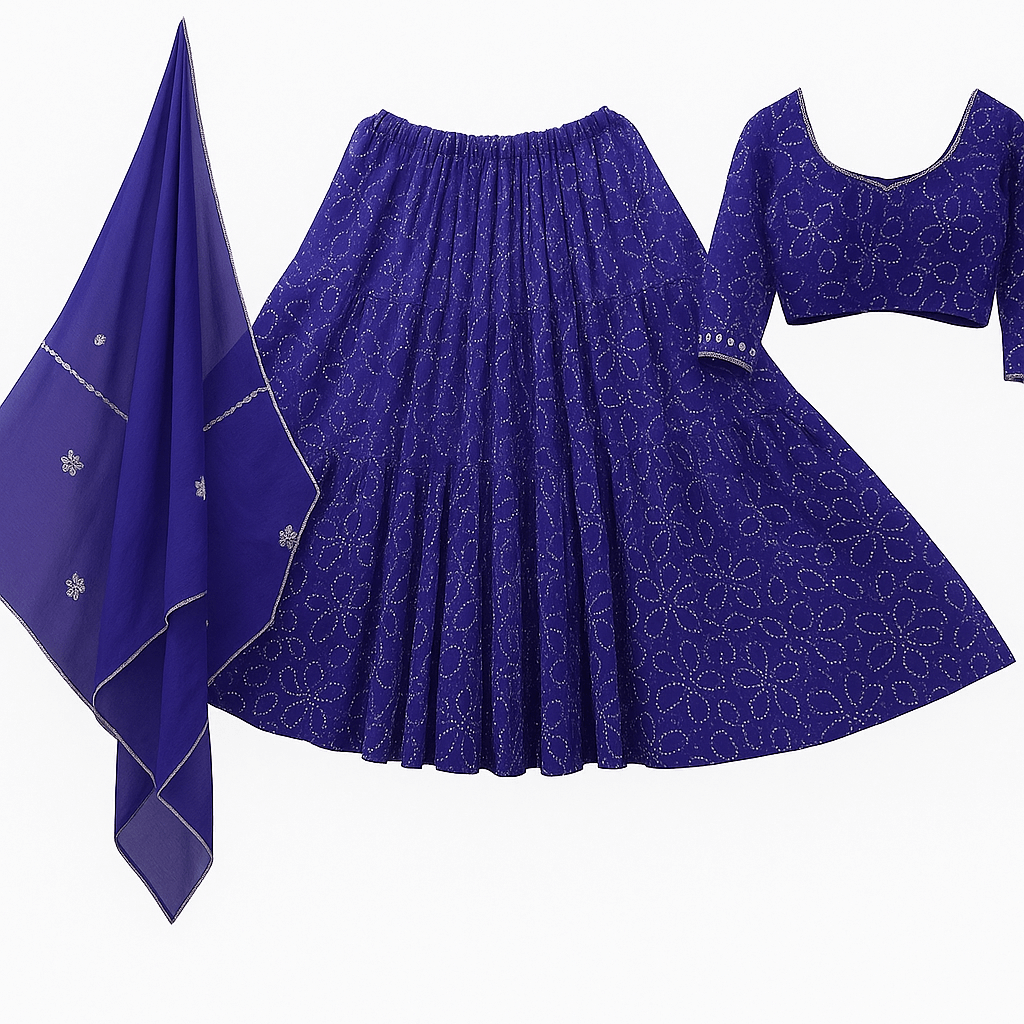 The lehenga is a traditional Indian garment that has been worn for centuries, particularly in North and West India. Originally worn by Mughal women, the lehenga became popular among Indian royalty and eventually spread throughout the subcontinent. The three-piece ensemble consisting of a fitted blouse, flared skirt, and dupatta represents one of the most elegant forms of traditional Indian attire. Mirror work, known as "shisha" embroidery, originated in the 17th century and has roots in Persian and Central Asian traditions. This reflective embellishment technique was believed to ward off evil spirits while adding sparkle and glamour to garments. Today, lehengas remain a preferred choice for weddings, festivals, and special celebrations, symbolizing grace, tradition, and cultural pride.