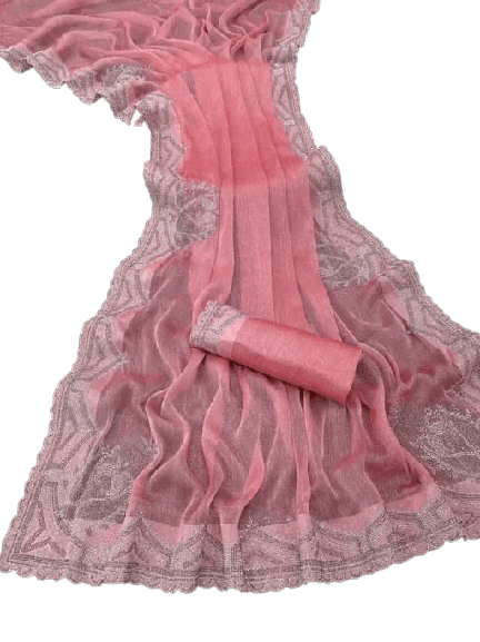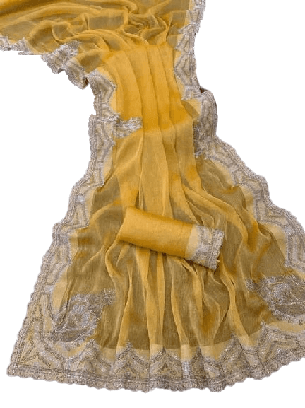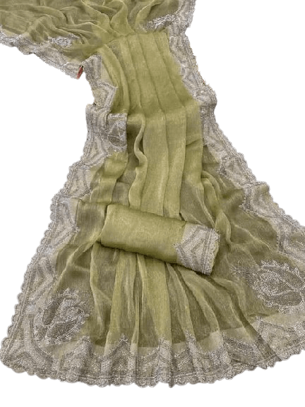 The saree is a traditional Indian garment consisting of a long piece of fabric draped around the body. Silk sarees have been part of Indian textile tradition for centuries. The 5.5-meter length is the standard measurement for traditional saree draping. Embellished sarees often feature decorative work that varies by region and local craftsmanship techniques.